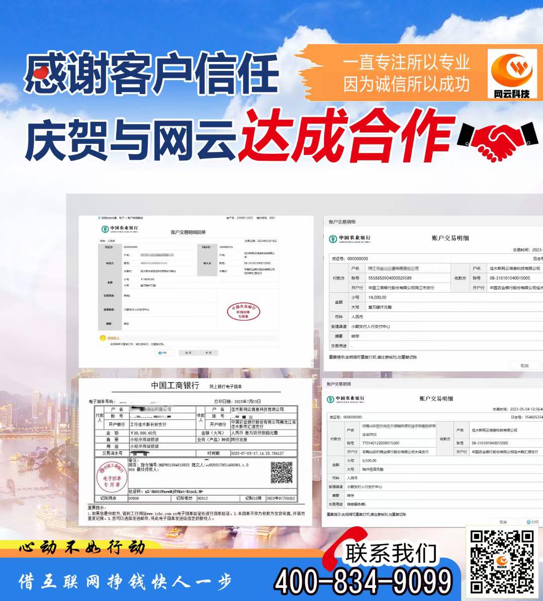 感謝客戶信任,慶賀與網云達成合作!!一直專注所以專業,因為誠信所以成功,選擇網云,選擇靠譜,心動不如行動,借互聯網掙錢快人一步。